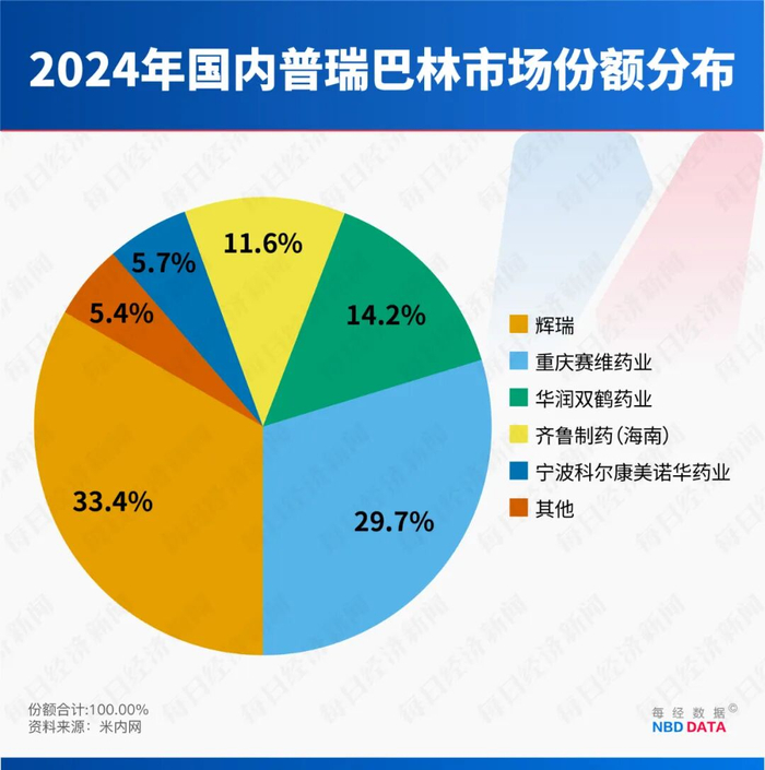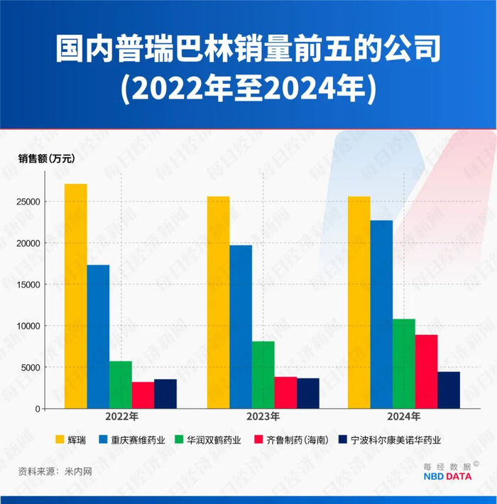 米内网数据显示,2022年至2024年,国内普瑞巴林总销售额逐年上升,分别为5.72亿元、6.28亿元和7.67亿元。2024年,市场份额排名前五的厂商分别为辉瑞/晖致(33.4%)、重庆赛维(29.7%)、华润双鹤(14.2%)、齐鲁制药(11.6%)和宁波科尔康美诺华(5.7%)。