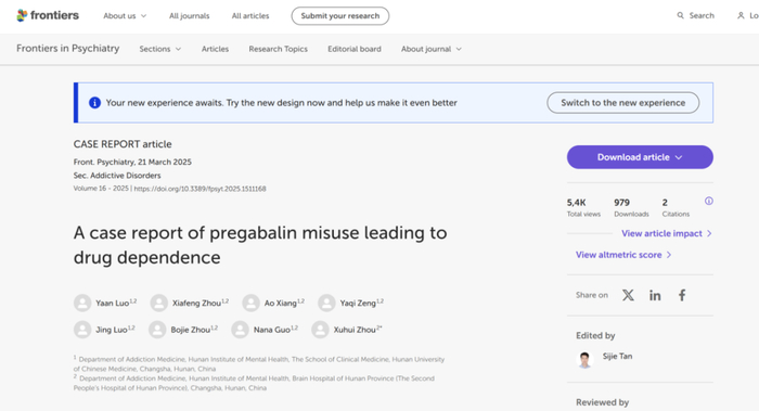 该论文指出,这是国内首次公开报告的普瑞巴林滥用致成瘾病例。